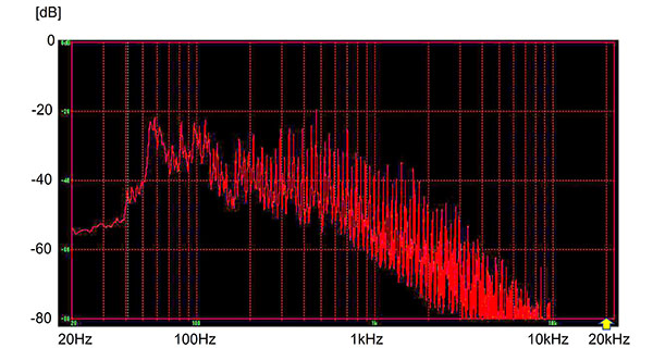 全体をみると、60Hz付近と100Hz付近をピークに、なだらかに左下がりの形状をしています。高音側は、10kHz付近で-80dBとなっており、あまり高い周波数までははいっていないようです。