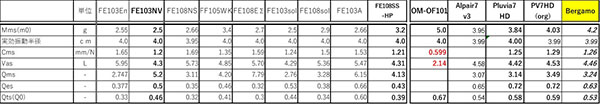 の位置になるように、近接して配置します。ここで、aはスピーカーユニットの実効振動半径です。下に参考値として、国内外の10cmのスピーカーのTSパラメータの一部を例として一覧表で示します。