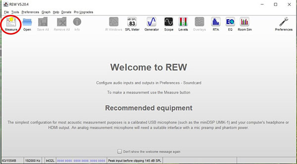 SPLメーターのキャリブレーション設定を完了すると、REWの初期画面の上に並んでいるボタンで、左端の " Measure " が使えるようになります。