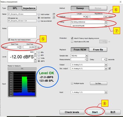 ハイレゾの場合などは、より高い周波数も設定可能ですが、上限は、サンプリング周波数の半分の値です。今回では、192/2=96kHzが設定の上限の値となります。 - ⑥ スイープ長さと、測定回数を設定できます。スイープ長さが2倍になるとS/N比が、約3dB向上します。Helpには、1Mスイープを使用する場合は、少なくも4GBのメモリと高速のプロセッサを、また、4Mスイープの場合は、少なくとも8GBを勧めています。今回仕様のPCは、24GBで、Ryzen7 5700Uですので、能力的には問題ないかと思われます。ここでは、1Mを2回スイープと設定しました。