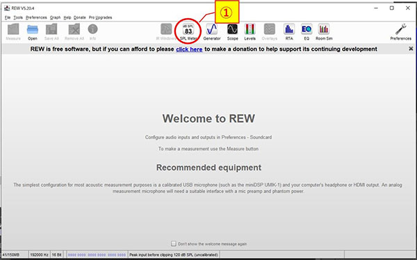 REWを立ち上げた画面の上の段にある 赤丸で囲んだ①の SPL Meter をクリックします。