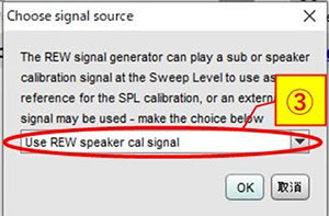 ③で示すようにプルダウンメニューから、Use REW speaker cal signal を選びます。