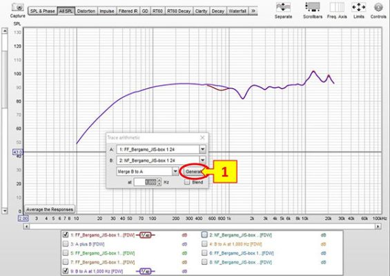 次に、中高域領域を、スピーカーから1m離れた距離にマイクをおいて測定するファーフィールド測定で行い、その2つの結果を統合(merge)することで低域から高域までの全体の周波数特性を得るという手法です。