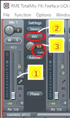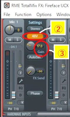TotalMixFXの画面を表示させて、①で示しているMic1のスパナのアイコンをクリックすると、図のように調整画面が表示されます。ここの②でファントム電源の48Vをオンにできます。