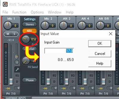 この場合は、マイクゲインを調整することで、この表示が出なくなります。今回、例として用いているRMEのFireface UCXですと、次のようにします。