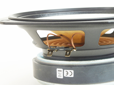 それとも関係するかもしれませんが、従来の製品では、コーン部の根本付近に、ハトメがあり、ここで、ボイスコイルのコイル線と端子に接続されている錦糸線が接続されていました。