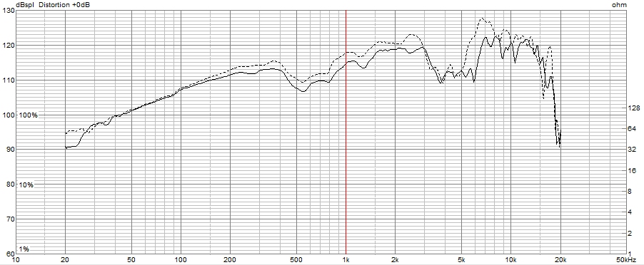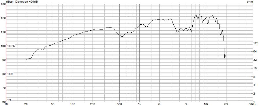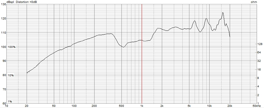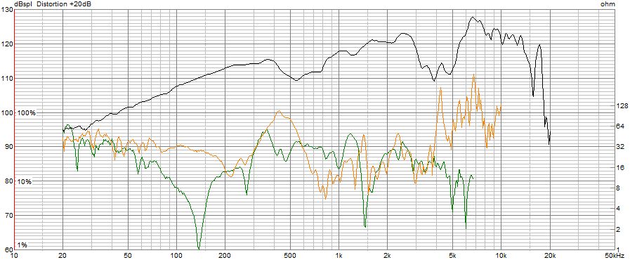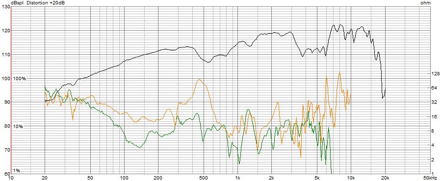 こちらの2次、3次高調波と周波数特性の関係も、FE208NSと似たような傾向を示しており、2次高調波が、400-500Hzと4kHz付近で突出しています。ちなみに、500Hzでの2次高調波歪は、110.5-(98.5-20)=32dBで、39.8分の1となり、約2.5%となっています。