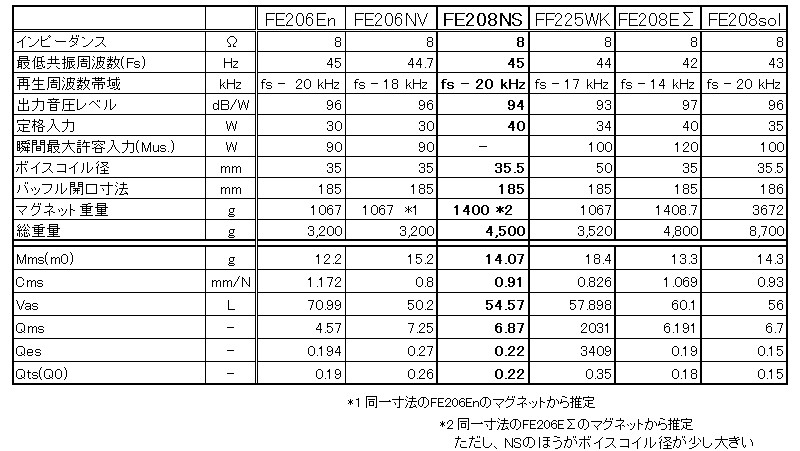 Fostexから公開されている各データを用いて、FEシリーズの現在の定番4つと旧型(En) 及び限定版(sol) 1つの計6ユニットの値を一覧表にしました。ここでは、FE208NSを太字にしてあります。