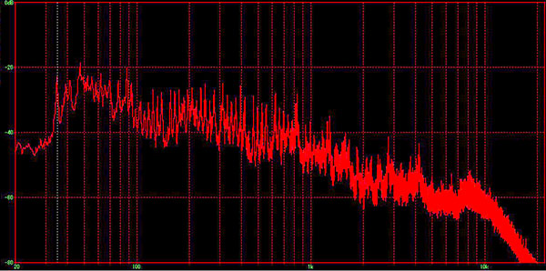 本アルバム2曲めの" Funky AECO " の全曲のピーク値の連続データの周波数特性を、下図に示します。20Hz台まで、-40dB 以上の高い音圧で録音されています。通常のメインスピーカーには再生できず、振動板がフラフラと動く現象を引き起こすので、サブソニックフィルター(ハイパス・フィルター)を入れたほうが無難です、