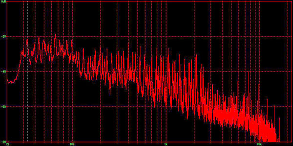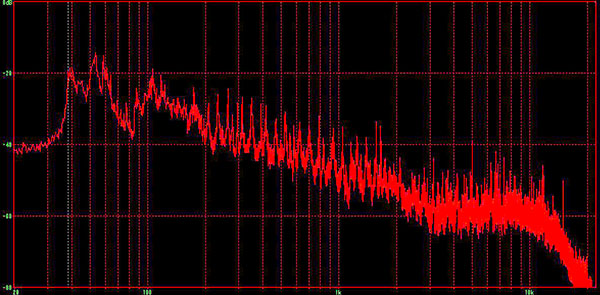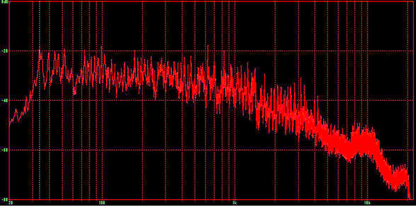 下に示すピーク値の周波数特性を見ると、最近の録音の傾向で、30Hz以下は、バッサリときられていますが、30Hz以上では、各楽器が高い音圧で録音されているのがわかります。