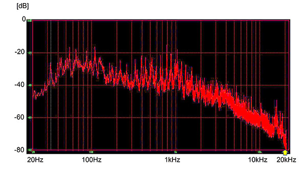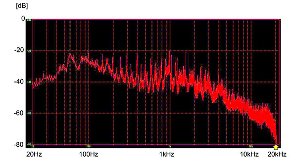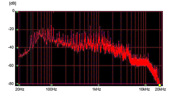 目立つピークが、低域側の58Hz付近と100Hz付近、また、中域の1KHz付近に突出してあります。高域側は、20kHzまで、ほぼ-60dB前後と比較的高い値となっています。