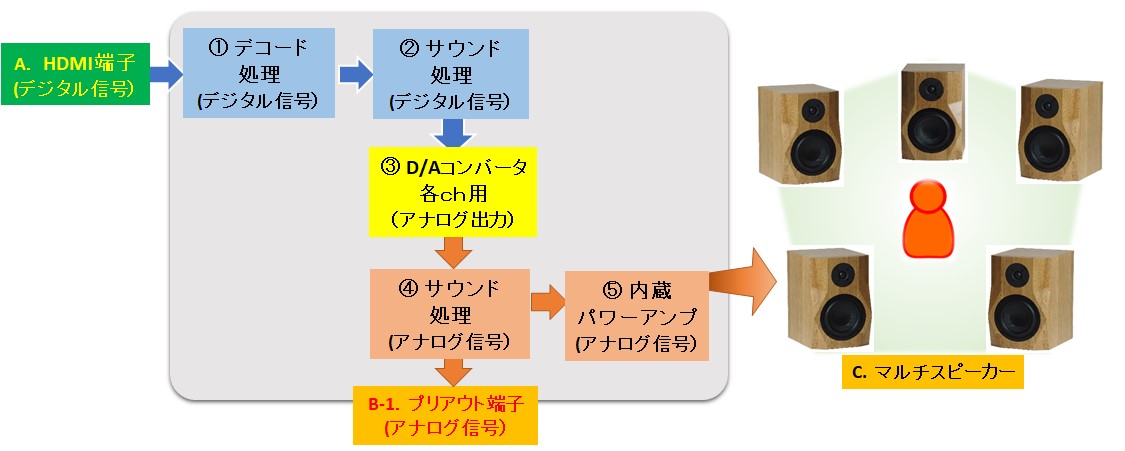図1 AVアンプにおける音声信号の流れ(ブロック図)