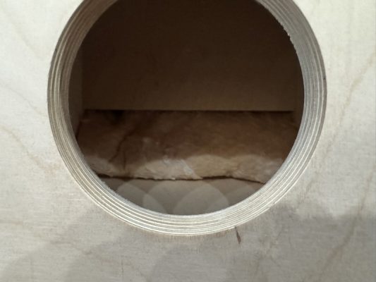 音道出口の調整だけでも、十分に中低域の調整ができますので、まずは出口側から試してみてください。音道部分への吸音材は低域のアッテネーターみたいな役割をしますが、当然アッテネーターは効かせすぎると音の勢いを落としますので必要最小限にとどめてもらえるとよいかと思います。