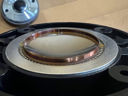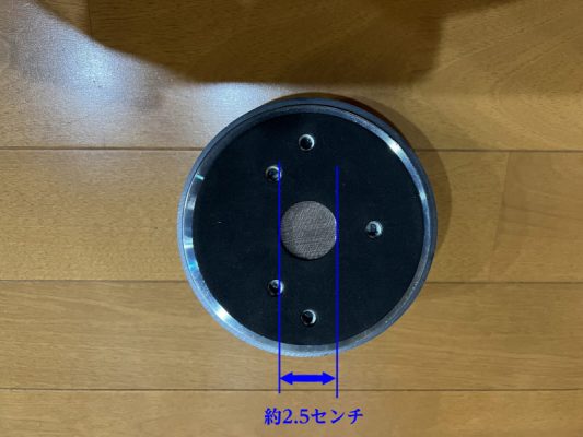 1インチはだいたい2.5センチですので、出口の直径が2.5センチのコンプレッションドライバーが1インチ用。2インチ用のコンプレッションドライバーは倍の5センチの直径になります。1インチ用のコンプレッションドライバーですと、振動板は倍の2インチサイズのものが使われています。
