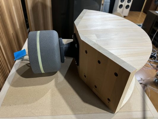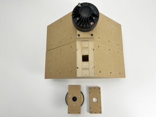 ある程度有名なコンプレッションドライバーに合わせて汎用性のあるモデルにしたいと思っていますが、まずは作ってみたのを、コイズミ無線さんで購入したBeymaの一番安価なCD10NDNと試作していたサブウーファー用の20センチ2発のウーファーと合わせてみました。