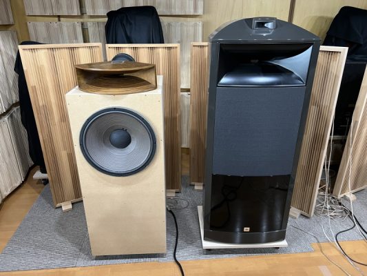コンプレッションドライバーは能率が110dB/Wと高いために、ウーファーも高い能率の大口径ものが合わせやすいです。ホーンはもともとアンプが非力な時代には劇場などで少しでも高い音圧を得るために利用されていた背景があります。