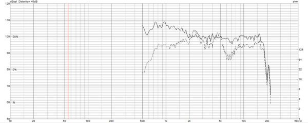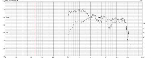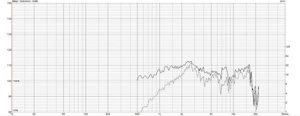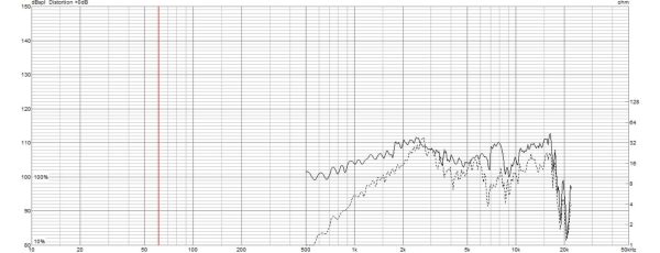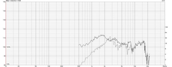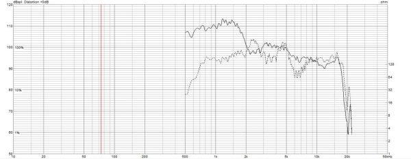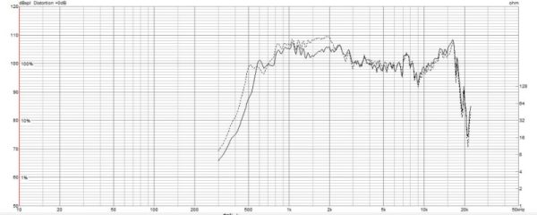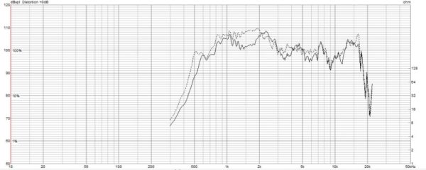 ちなみに点線は、コンプレッションドライバーのみで測定したものです。実線部分がホーンで持ち上げられた特性です。